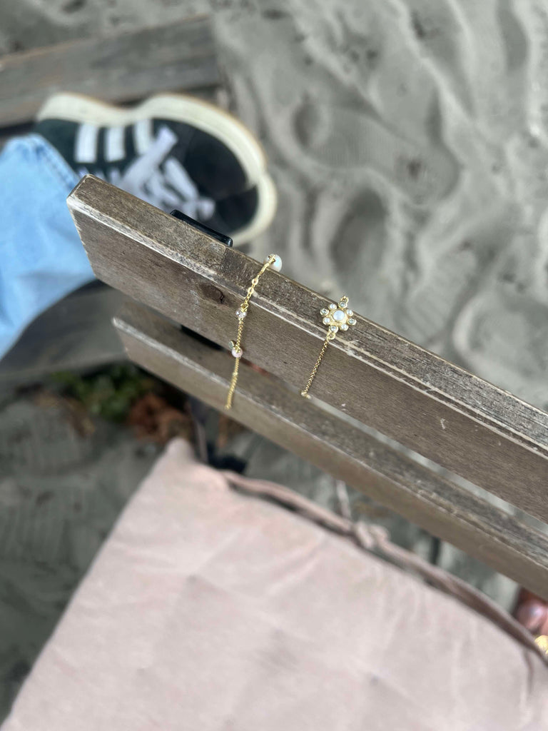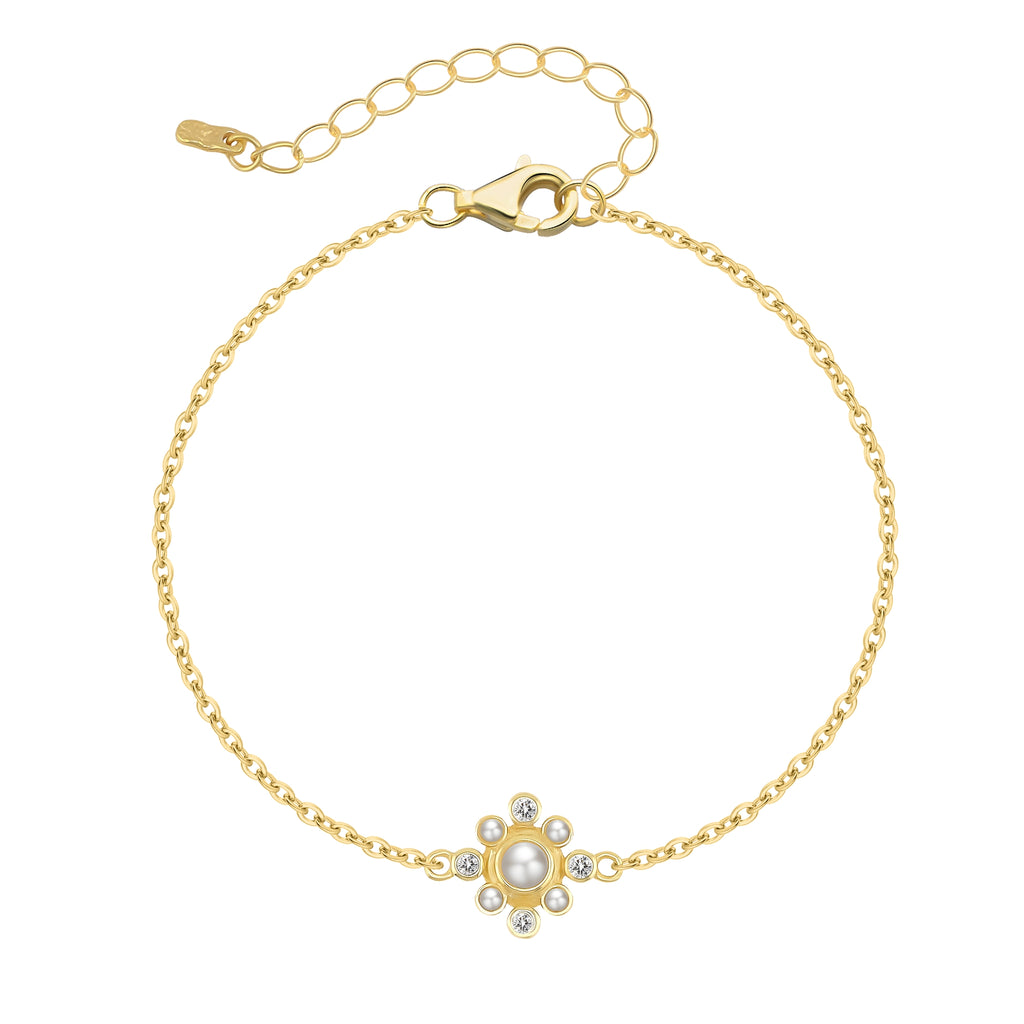 Gloria armbåndet er fremstillet i 14 karat guldbelagt sterling sølv og har et smukt blomstervedhæng pyntet med perler og glitrende zirkonia. Et enkelt og elegant smykke, der tilføjer et feminint touch til enhver stil.