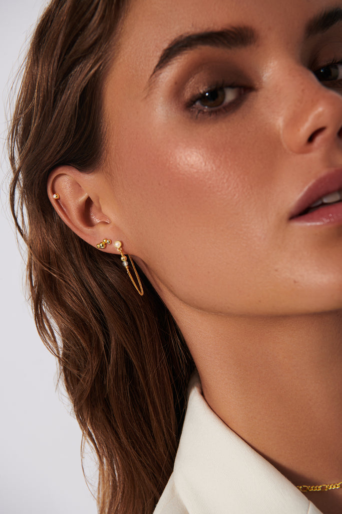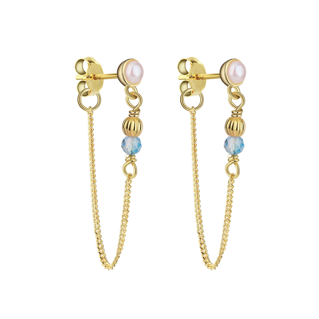 Celeste øreringe er et par fine rå stik øreringe med smukke ferskvandsperler, blå zirkona sten og fine kæder - de passer perfekt til at mixe med stilrene øreringe, men kan også sagtens bæres alene for et elegant eller råt look.