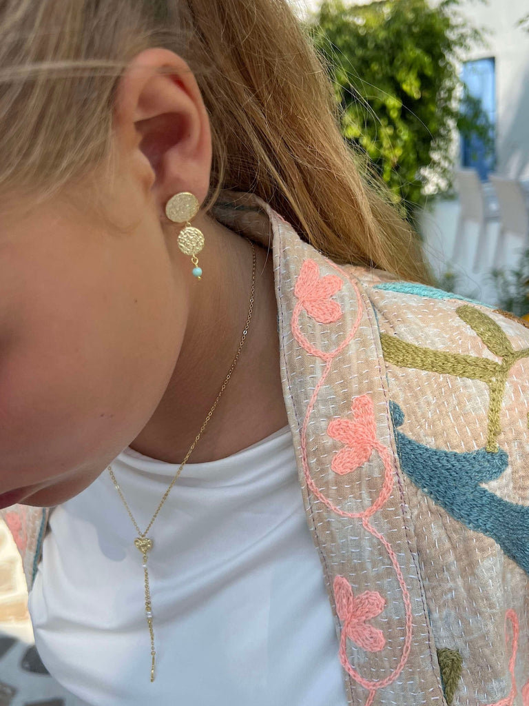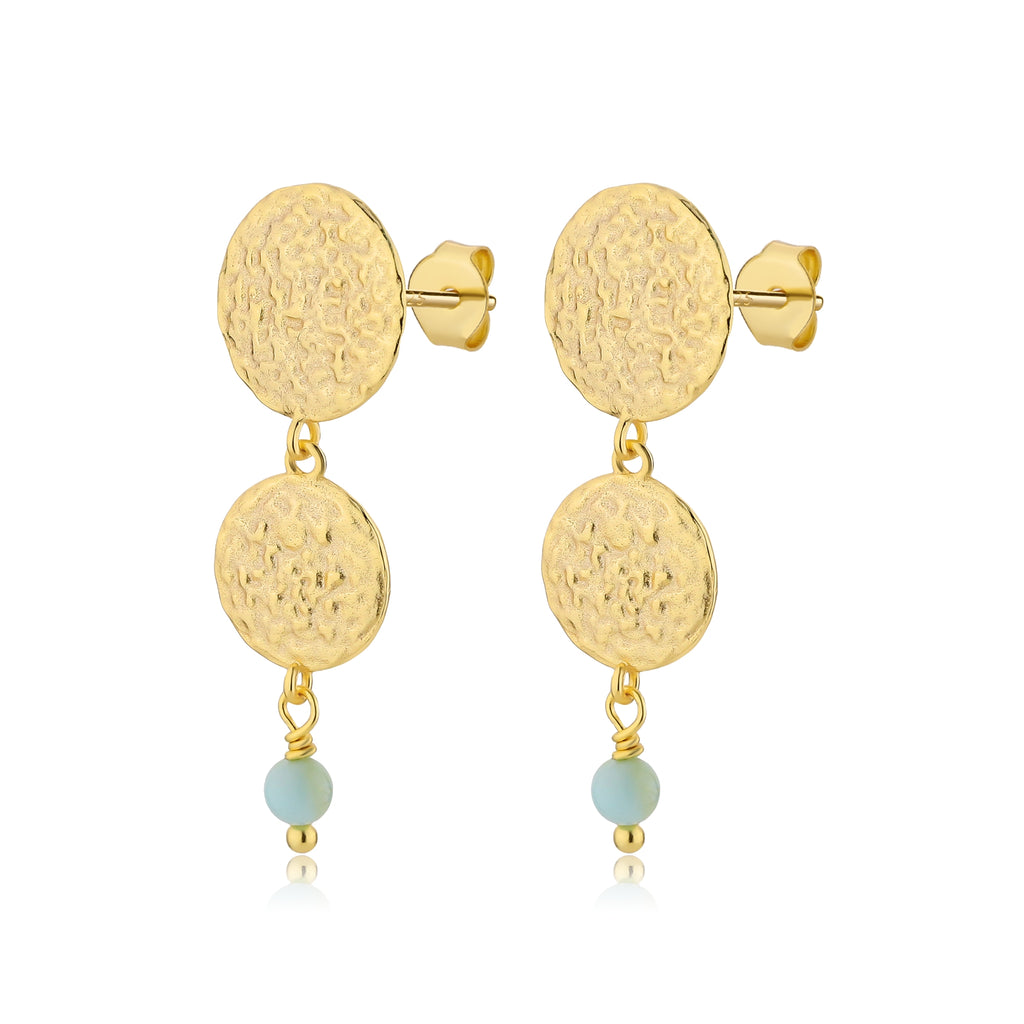 Sisse-Marie øreringene er designet i 14 karat guldbelagt sterling sølv med to smukke, runde vedhæng i forskellige størrelser. Nederst på øreringen hænger en dybblå lapis perle, som tilføjer et elegant touch til designet. Den rige blå farve skaber en flot kontrast til det varme guld og fremhæver øreringenes sofistikerede udtryk. Et stilfuldt smykke, der tilfører elegance og personlighed til både hverdag og festlige lejligheder.