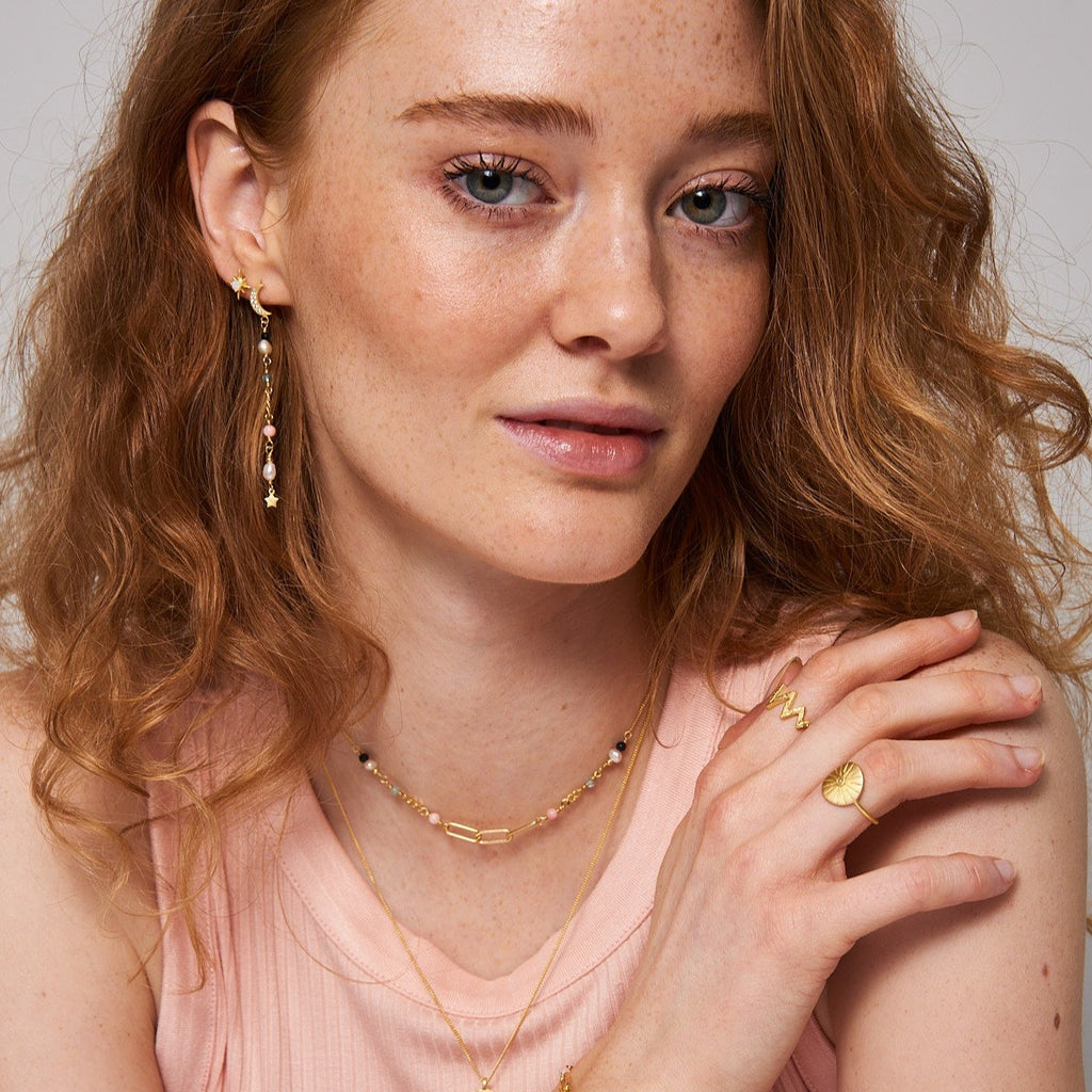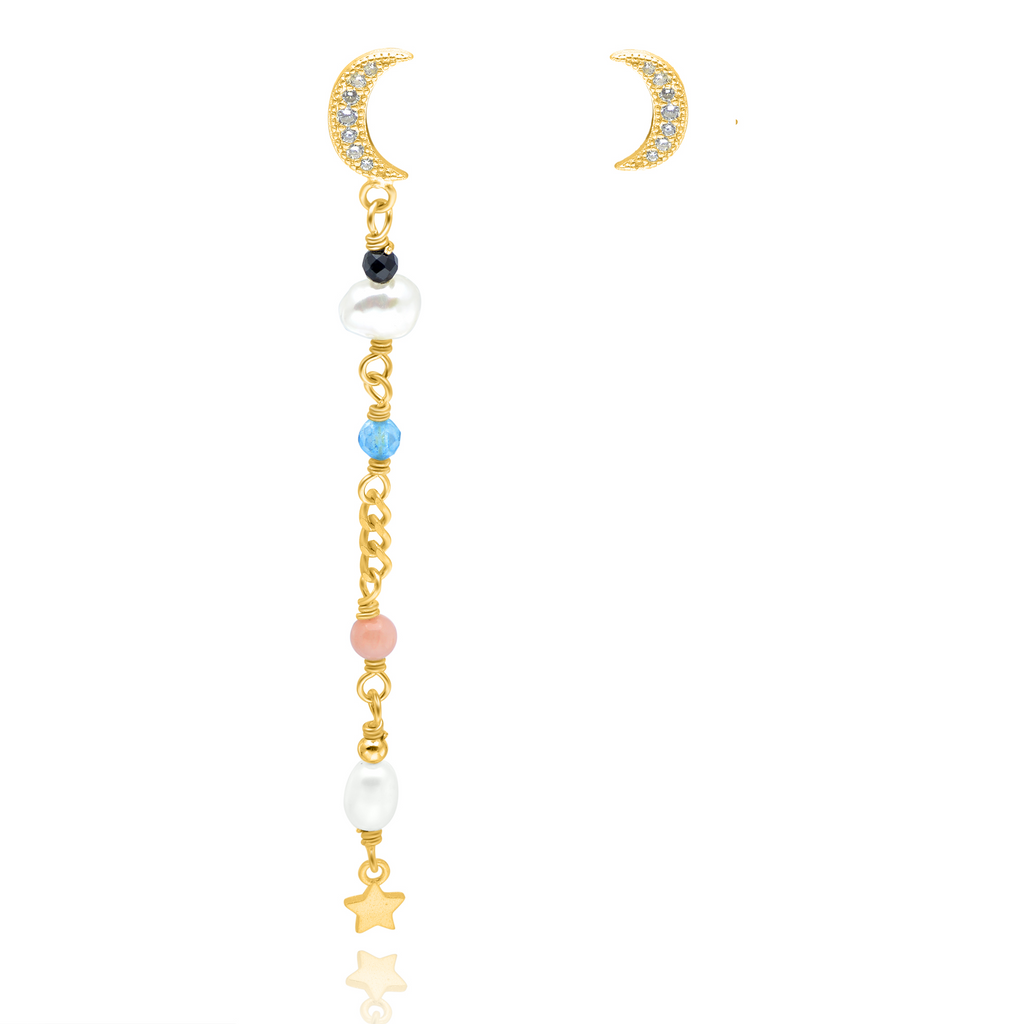 Smukke mix øreringe med måne stik, ferskvandsperler, halvædelsten og zirkonia i 14 Karat guldbelagt 925 sterling sølv.