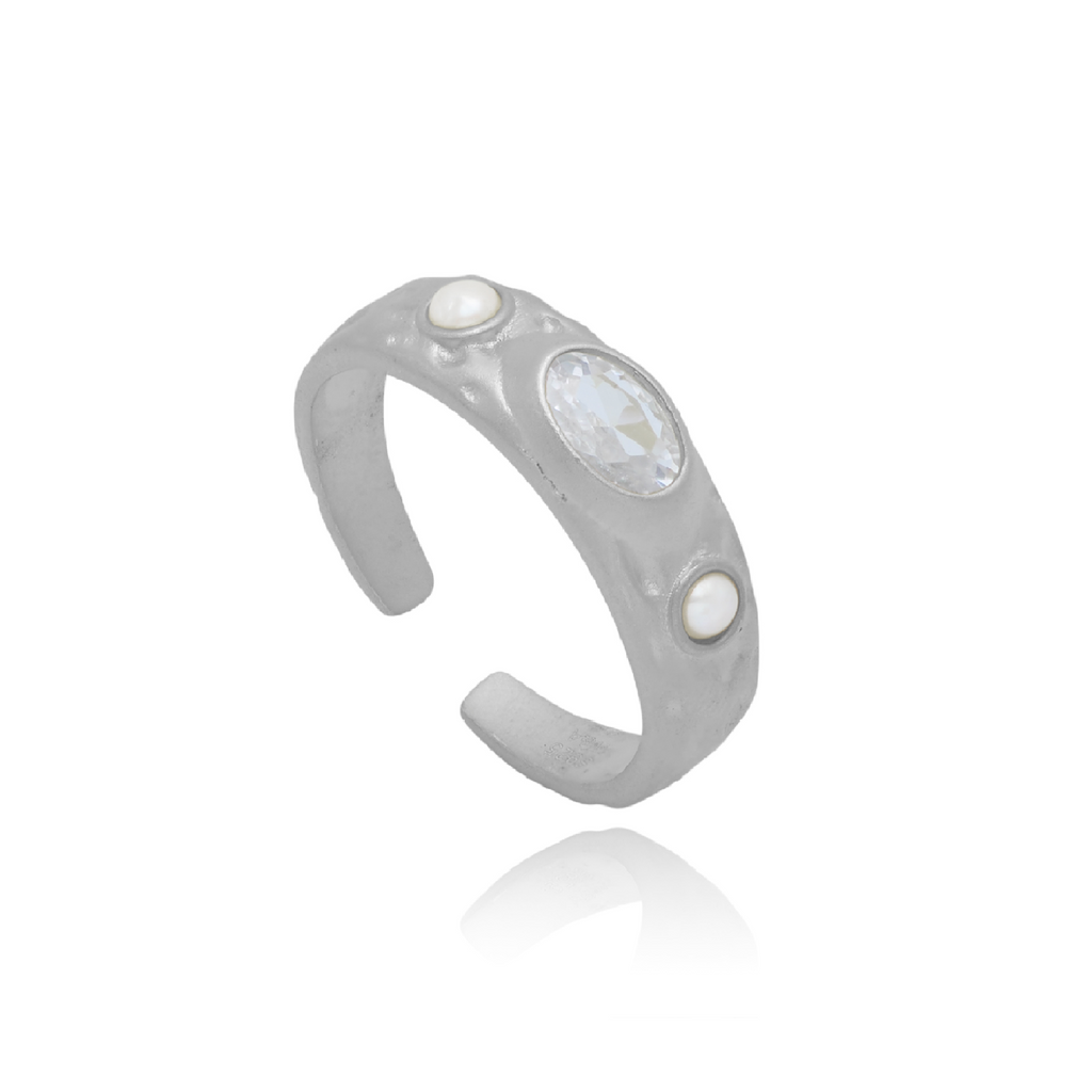 Smuk ring i sterling sølv med fin stor zirkonia og hvide perler. Ringen kan sagtens mixes med andre ringe, og den passer perfekt til et par rå jeans eller en smuk sommerkjole.