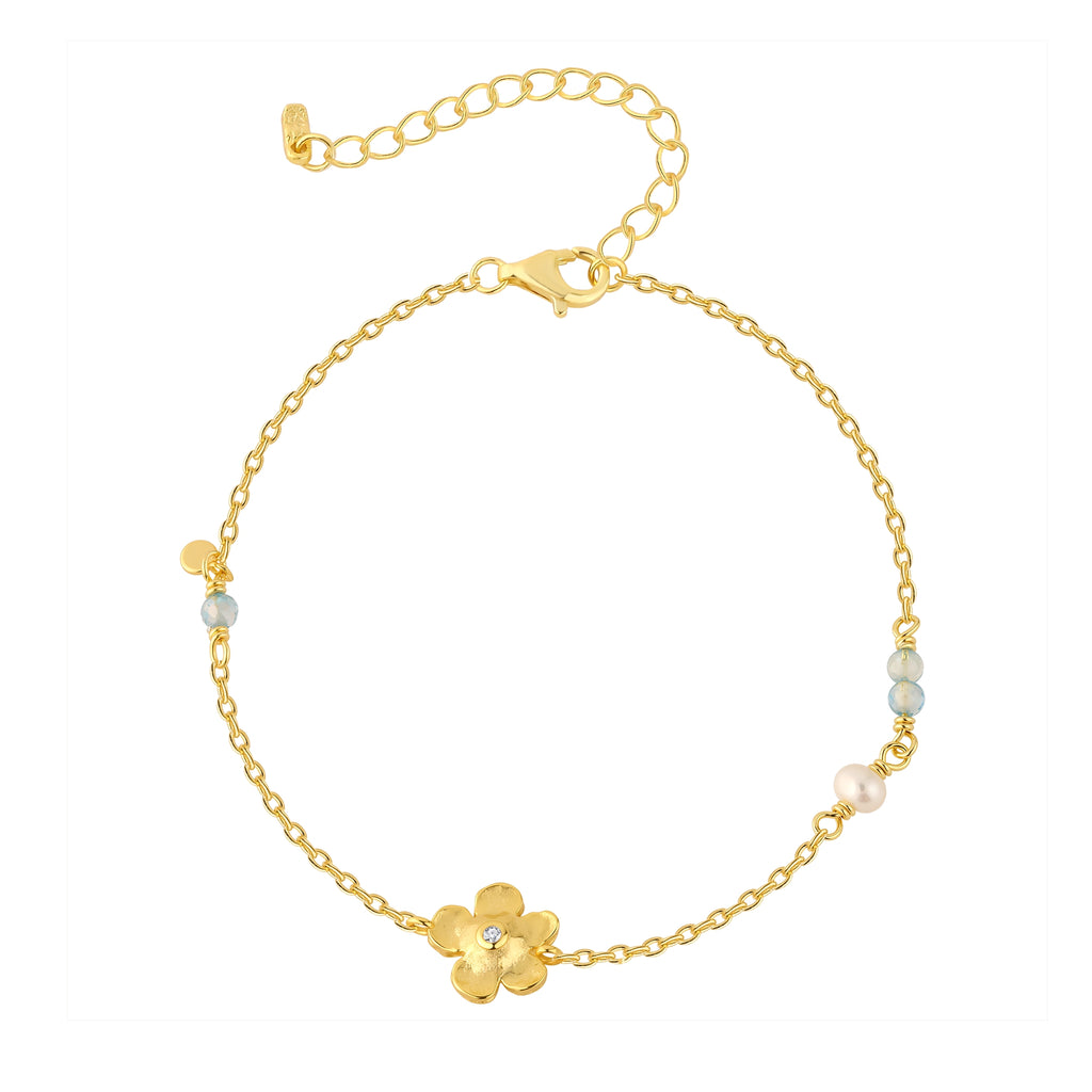 Kamila armbåndet er lavet i 14 karat guldbelagt sterling sølv og prydet med smukke blå zirkonia perler, fine ferskvandsperler samt et vedhæng af blomsterdetalje med en zirkonia i midten. Et elegant og farverigt smykke, der tilføjer et unikt touch til ethvert look.